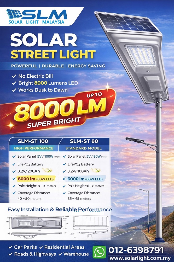 智能太阳能路灯安装|提升停车场安全照明 该停车场在夜间原本非常昏暗,缺乏完善照明,给用户带来安全与视线上的担忧。随着使用反馈增加,管理团队也逐渐意识到夜间车辆进出存在一定风险。经过多方评估后,管理层开始寻找一种更实用、成本更低且无需大规模布线的照明解决方案。 马来西亚专业太阳能灯供应商|节能高效照明方案 我们推荐使用太阳能路灯系统,因为它无需电力布线,安装过程更加快速、整洁且方便,特别适合开放式停车场使用。系统完全依靠太阳能供电,白天充电,夜晚自动亮灯。安装完成后,整个停车场的照明明显改善,夜间更加明亮安全,车辆与行人通行更安心。管理层对效果非常满意,不仅提升了安全性,也有效降低了电费及后期维护成本。如果您正在寻找可靠的太阳能灯或太阳能路灯供应商,欢迎联系 SLM Solar Light Malaysia 了解更多详情。 WhatsApp:https://wa.me/60126398791